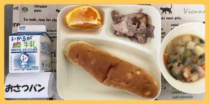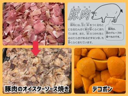今日の献立は、豚肉のオイスターソース焼き・あつあげと野菜の中華煮・デコポン・おさつパン・牛乳でした。
