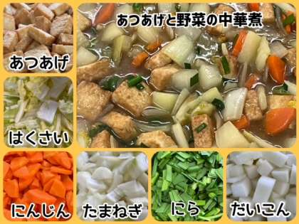 中華煮は、あつあげを主材にはくさい・だいこん・たまねぎ・にんじん、青みににらを使用し、最後にでん粉でとろみをつけた中華風の煮ものです。