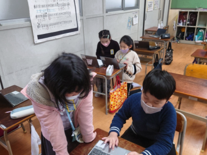 今日は、1人1台端末を使って、興味をもった国の国旗や使われている言葉、食べ物、日本とのつながりなどについて調べました。