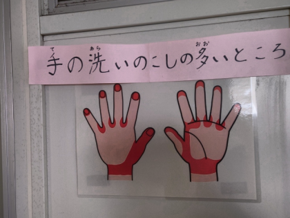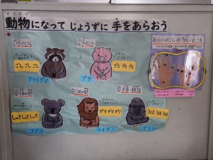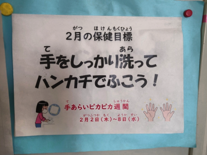 2月の保健目標は「手をしっかり洗ってハンカチでふこう!」。