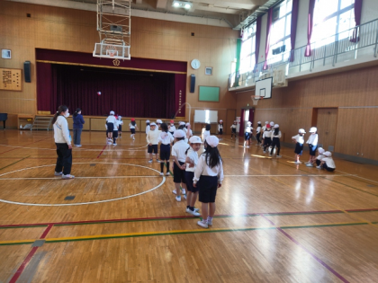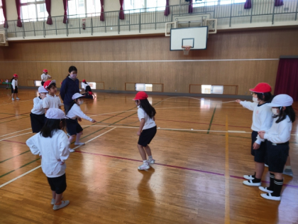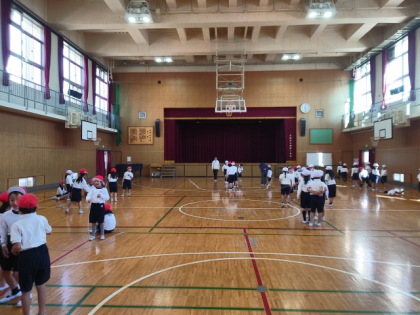 2クラス合同で、グループに分かれて、大なわとびを練習しました。