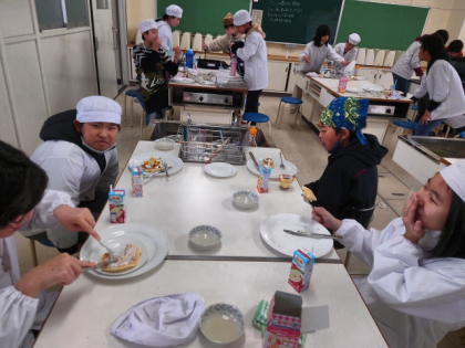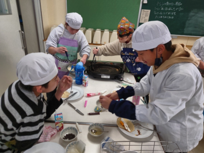 家庭科の時間は、ホットケーキミックス、卵などを材料にして「パンケーキ」を作りました。
