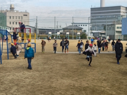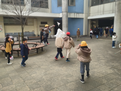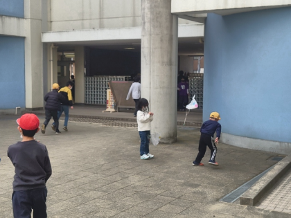 1年生の子どもたちが「パラシュート」を作って遊んでいました。