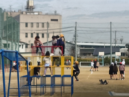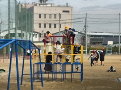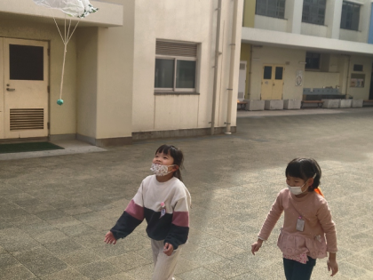 今度は、もっと高いところからパラシュートを落とそうとジャングルジムに登っています・・・が、残念ながらチャイムが鳴ってしまいました。