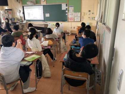 今日の児童朝会は、多目的室と各教室をオンラインで結んで行いました。