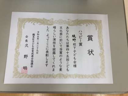 朝会の最後に、1月29日の「鶴見区こども文化祭」で、焼野子ども会のソーラン隊の人たちが「ハッピー賞」をいただいたので、代表者に表彰状を渡しました。