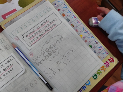「4人が いすに すわって います。いすは あと 6きゃく あります。いずは ぜんぶで なんきゃくでしょう。」や「ふうせんが 12こ あります。7人の 子どもに 1こずつ あげると ふうせんは なんこ のこりますか。」の問題について考えています。