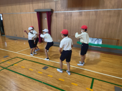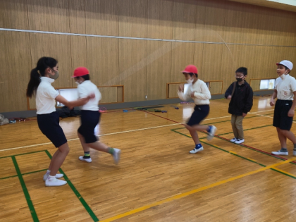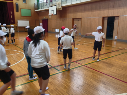 体育の時間は、グループに分かれて大なわとびを練習しました。