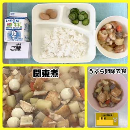 関東煮は、鶏肉・うずら卵・ちくわ・じゃがいも・こんにゃく・あつあげ・だいこん・にんじんを使用しています。この献立は【うずら卵】の除去食対応献立です。誤配・誤食を防ぐため、一食分ずつピンク色の食器に取り分け、クラスと名前を書いた個票をつけて提供しています。