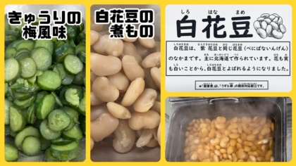 今日の献立は、関東煮・きゅうりの梅風味・白花豆の煮もの