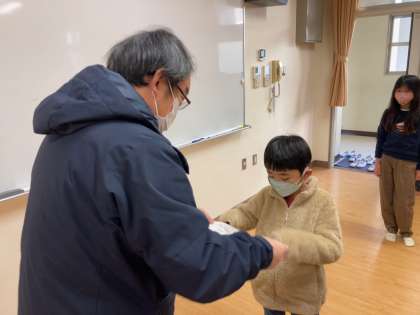 今日の児童朝会は、多目的室と教室をオンラインで結んで行いました。