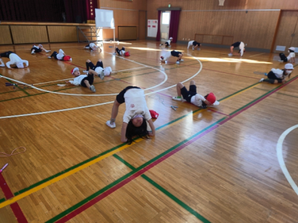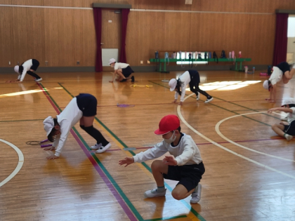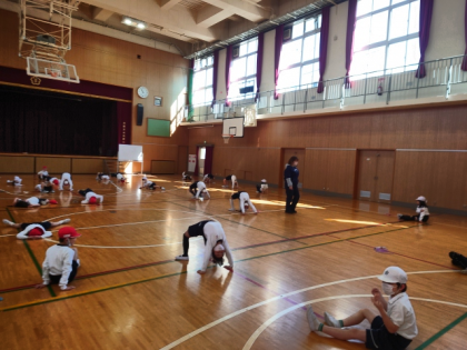 「ブリッジ」や「かえるとび」を練習したあと、グループで協力してマットの準備をしました。
