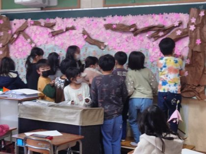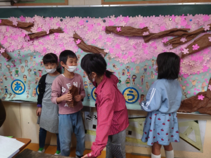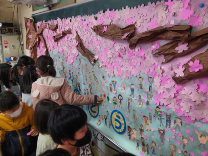 2年生のみんなで卒業をお祝いする掲示物を作っています。