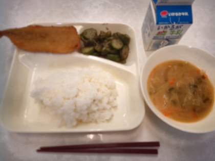 今日の献立は、いわしフライ・みそ汁・きゅうりの赤じそあえ・ごはん・牛乳でした。