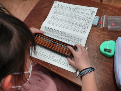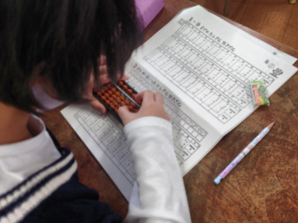 「1〜4までの たしざん、ひきざん」「1〜5までの たしざん、ひきざん」「1〜9までの たしざん、ひきざん」「2けたがはいった たしざん、ひきざん」「たせない5のたしかた」「たせない9のたしかた」「たせない3のたしかた」など、そろばんの基本を教えていただきました。