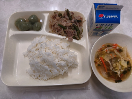 今日の献立は、豚肉と野菜のいためもの・すまし汁・きな粉よもぎだんご・ごはん・牛乳でした。