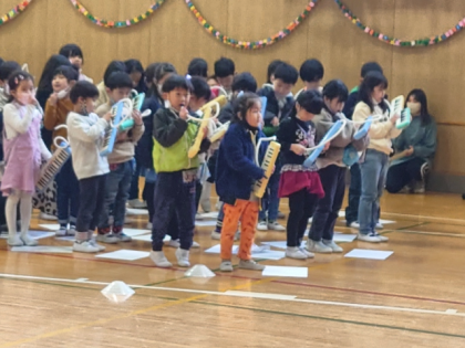 1年生の出し物は、鍵盤ハーモニカの合奏「きらきら星」と合唱「ドラえもん」の替え歌でした。