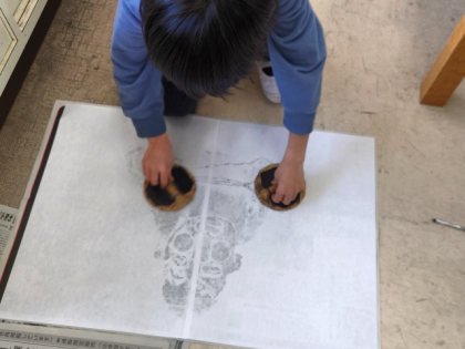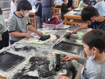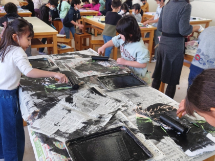 図工科の時間は、「あやとりをしている自分」を題材に、版画の作品を制作しています。