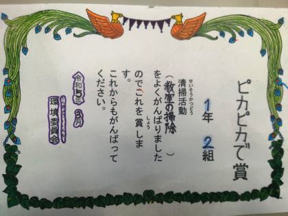掃除をよくがんばったクラスに贈られる「ピカピカで賞」。