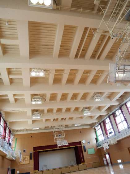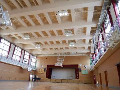7月〜8月に、体育館の工事がありました。震災等で天井が落ちてこないように撤去されました。少し天井が高くなりました。