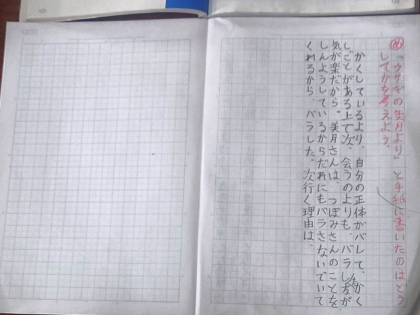 今日は、「『ウサギの葉月より』と手紙に書いたのはどうしてか」という課題について、自分の意見をノートに書いて考えました。