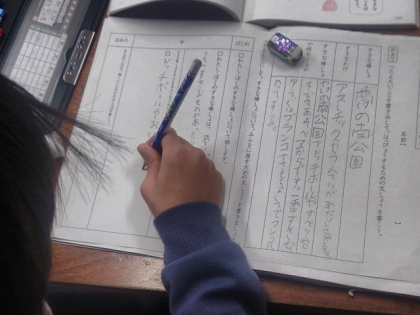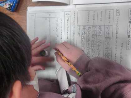 国語科の時間は、自分のお気に入りの場所について伝えたいことを書き出し、発表するための文を書いています。