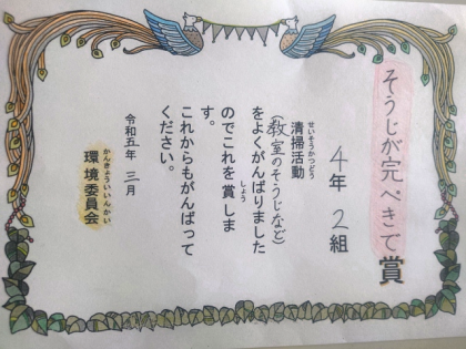 掃除をよくがんばったクラスに贈られる「そうじが完ぺきで賞」。