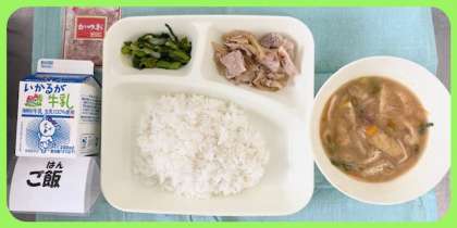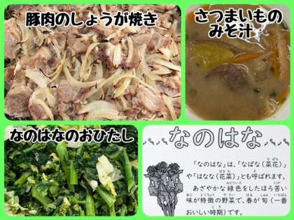 今日の献立は、豚肉のしょうが焼き・さつまいものみそ汁・なのはなのおひたし・ごはん・牛乳でした。