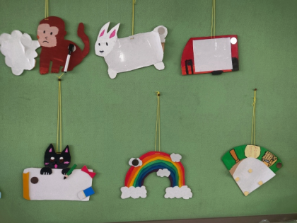 図画工作科の学習では、木の板を電動糸のこぎりで切って絵の具で色付けをし、自分だけの「伝言板」を作りました。