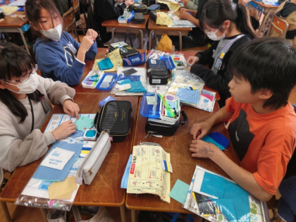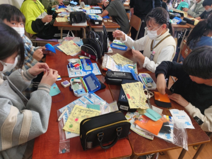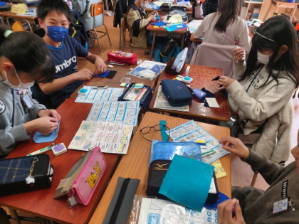 家庭科の時間は、フェルトを手縫いで縫って小物を作っています。
