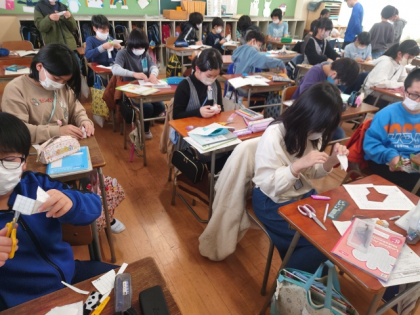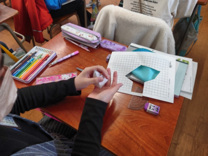 算数科の時間は、方眼紙に展開図を描いて、四角すいを作りました。