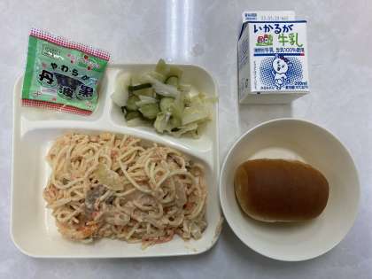 今日の献立は、さけのクリームスパゲッティ・キャベツときゅうりのサラダ・ソフト黒豆・黒糖パン(1/2)・牛乳でした。