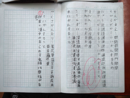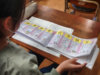 学習の終わりに「両」「礼」「転」「全」などのいろいろな漢字について、その部首が何か漢字ドリルで調べました。