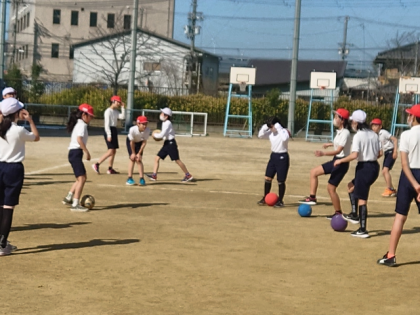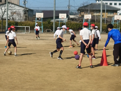体育科の時間は、運動場でサッカーの学習をしています。
