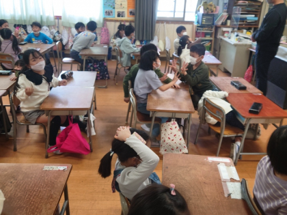 10種類の動物から1つ選び、先生が動物の名前を英語で言って、選んだ動物の名前が出てきたら机の上の消しゴムをすばやくとります。