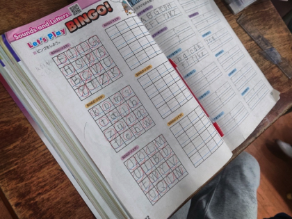 16このます目にアルファベットを入れておき、動画に出てきたアルファベットに印をつけて、縦・横・斜めのうちいずれかの列の印が全部そろったら「ビンゴ!」。