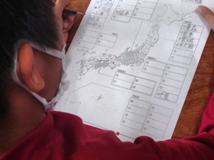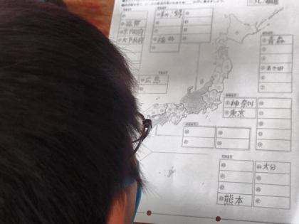 社会科の時間は、白地図プリントを見て、都道府県名を書き入れています。