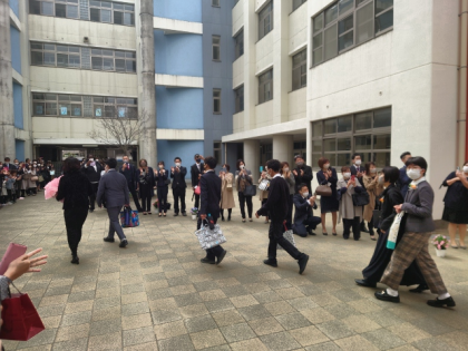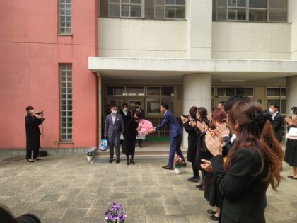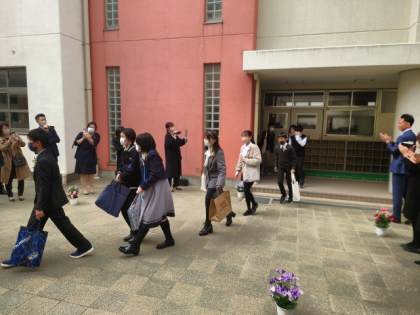 保護者の方と教職員でつくった花道を通って、正門へ。