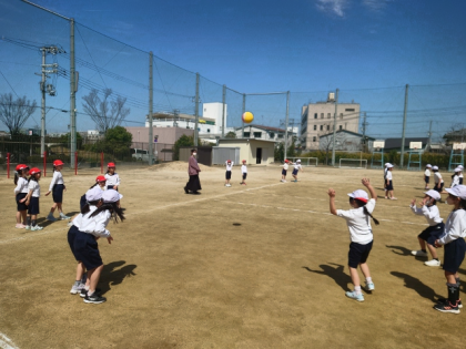 体育科の時間は、学年のみんなでクラス対抗のドッジボールをしました。