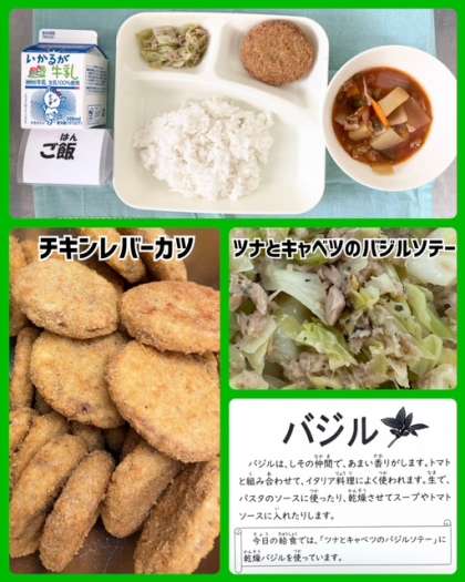 今日の献立は、チキンレバーカツ・ケチャップ煮・ツナとキャベツのバジルソテー・ごはん・牛乳でした。