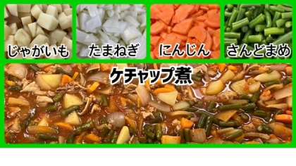 ケチャップ煮は、豚肉・じゃがいも・たまねぎ・にんじん・トマト(缶)、青みにさんどまめを使用し、ケチャップ・チキンブイヨンなどで味つけした煮ものです。