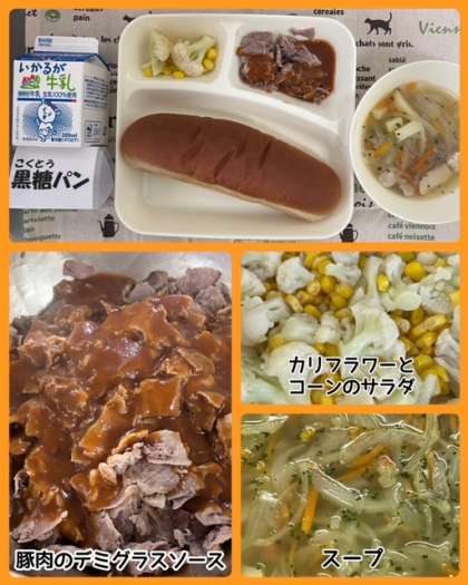 今日の献立は、豚肉のデミグラスソース・スープ・カリフラワーとコーンのサラダ・黒糖パン・牛乳でした。