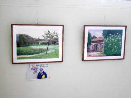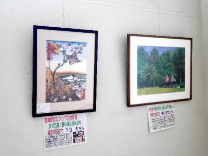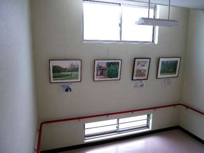 焼野地域の在住の方から、鶴見緑地を描かれている水彩画をお借りして、階段踊り場に展示しています。とてもうつくしいですね。家庭用ミシンでぬった刺繍画も地域在住の平山さんよりお借りして展示しました。絵画についてとは絵をときどき変えています。じっくりと鑑賞してくださいね。