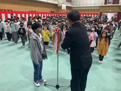 まず校長から、5年生の代表の児童に修了証を手渡しました。
