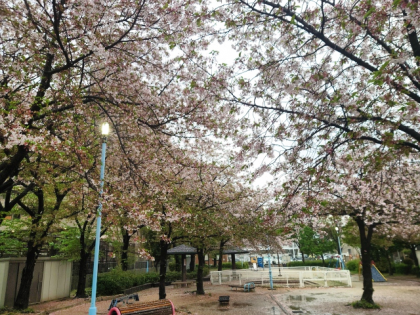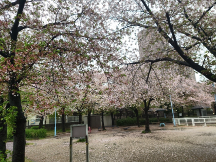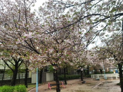 学校の桜は、ほとんど葉桜になってしまいましたが、さくら公園の桜はまだ花がたくさん残っています。