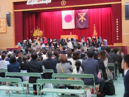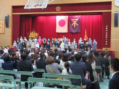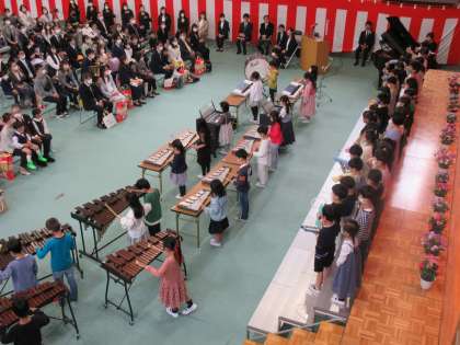 新2年生の子どもたちは、元気よくお祝いの言葉や「きらきら星変奏曲」の合奏、校歌の合唱を披露しました。