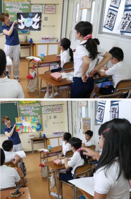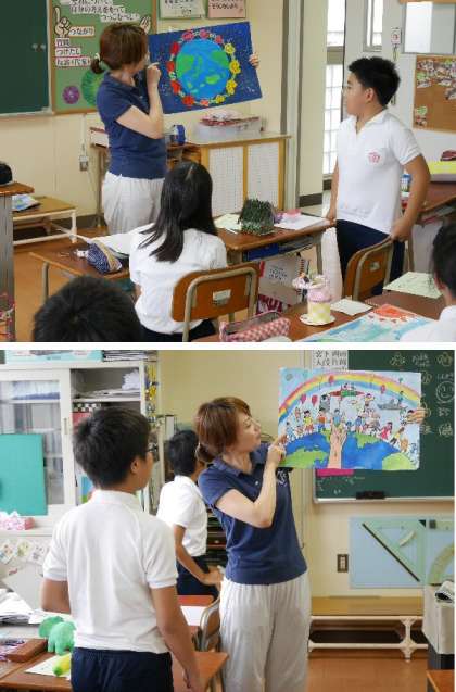 夏休みの宿題になっていた絵画をクラスで発表していました。戦後70年「平和」をテーマにした子ども絵画に応募します。なかなか考えて描かれていますね。