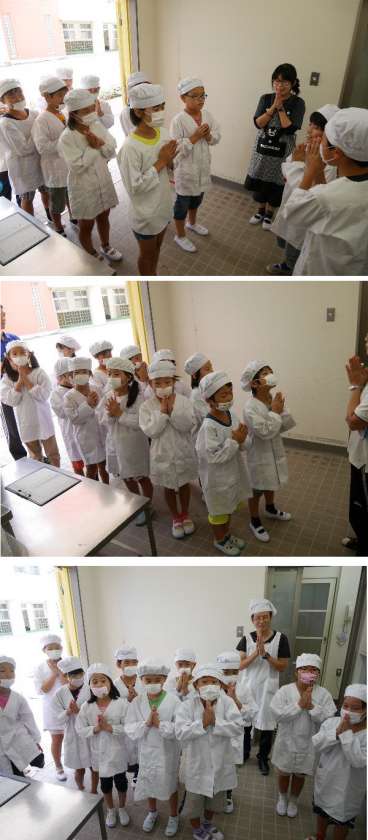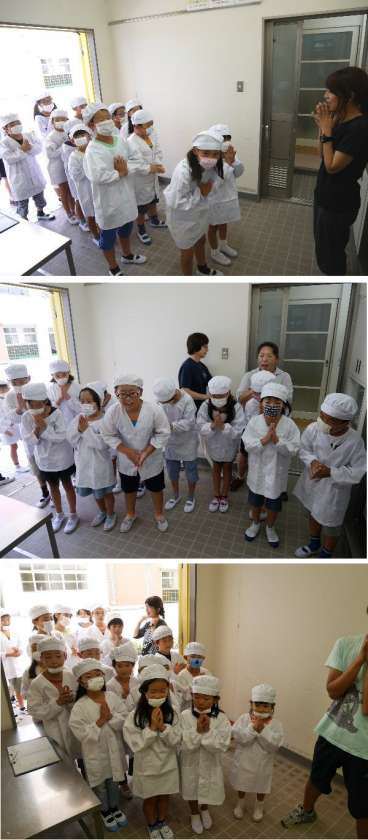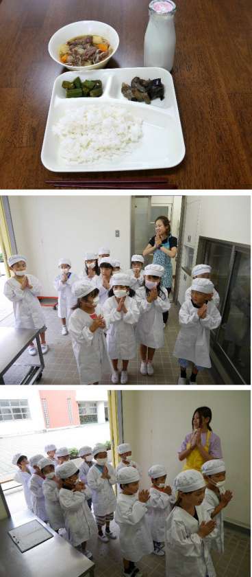 2学期の給食が始まりました。メニューは「肉じゃが」「焼きナスの味噌だれかけ」「オクラのおかか炒め」です。とてもご飯にあうメニューでおいしかったですね。いただきます。