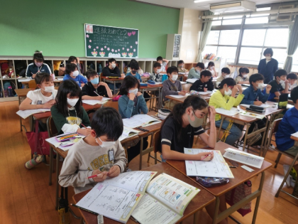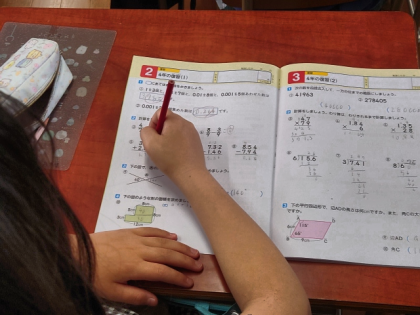 算数科の時間は、ドリルの4年生の復習問題を解いていきました。