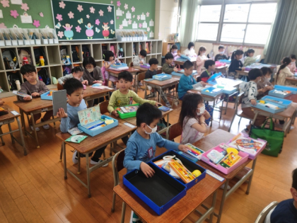 教室では、お道具箱に入っているものを1つ1つ確認していました。